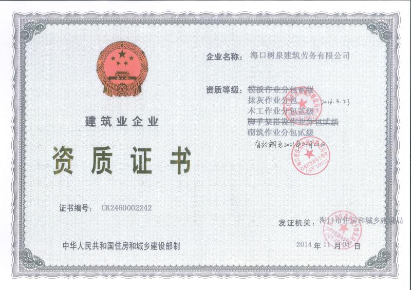海口樹泉建筑勞務有限公司成立于2011年,公司位于??冢淝吧硎且患覍I建筑施工隊,自2004年即開始在海南從事建筑勞務施工。自成立至今,公司已經擁有一支科學管理、質量過硬、能打硬仗,搶工期的專業隊伍。能獨立承擔大中型工業與民用建筑 、室內外裝修、各類機電設備安裝工程。代表工程有??跒I海華庭、三亞時代海岸T01/02/04/05棟高層、合肥東海花園二期、陵水富力灣B區高層、三亞金中海(酒店)、瓊海大印經典花園、??诃h球海景大酒店(四星級酒店,在建中)、陵水珍珠大廈(五星酒店)、??谌f達廣場、美蘭機場二期。